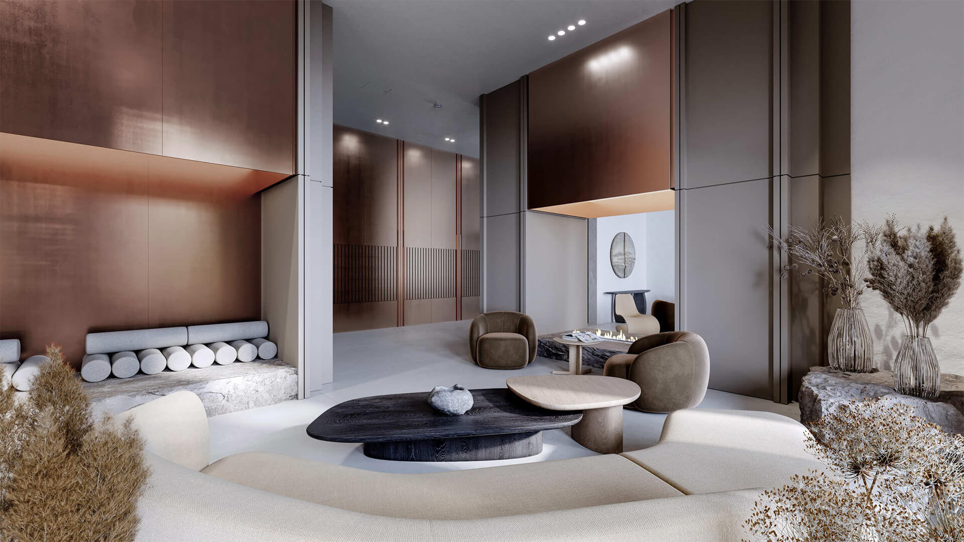 Гранд-лобби жилого комплекса «Среда на Кутузовском» — это не просто входная группа, а пространство, которое задает атмосферу всего комплекса. Дизайн лобби разработан с акцентом на современный стиль, комфорт и функциональность. В отделке использованы бронзовые металлические панели, контрастирующие со светлой декоративной отделкой стен и светлым полом из керамогранита. Это создает элегантную и современную атмосферу с первого шага.