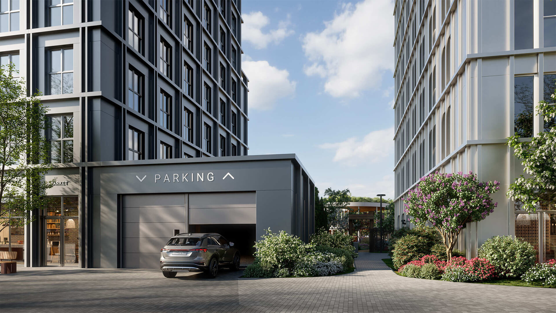 Паркинг оснащён системой контроля доступа и видеонаблюдением, что гарантирует безопасность автомобилей. Кроме того, предусмотрены специальные зоны для зарядки электромобилей, а также места для хранения велосипедов и колясок, что подчёркивает внимание к современным потребностям жителей и развитию экологически ориентированного транспорта.