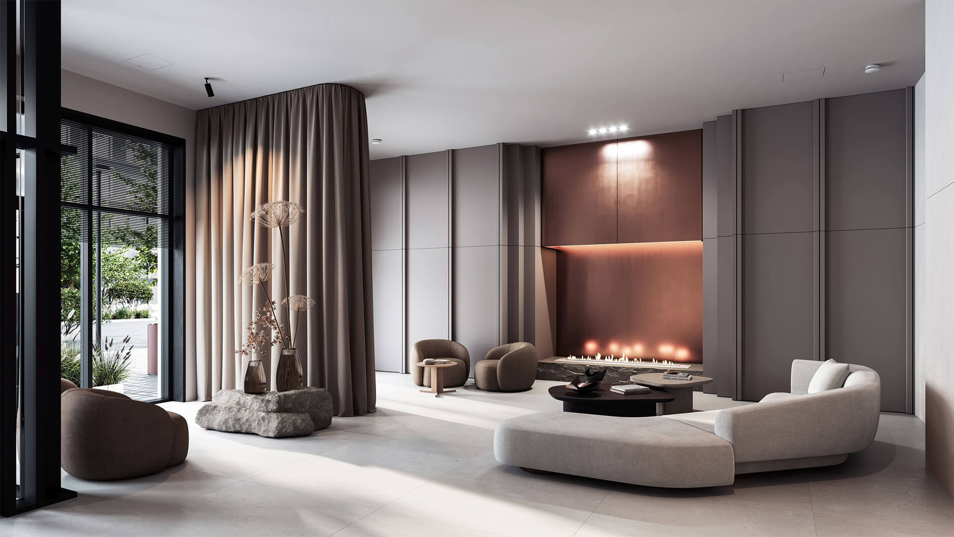 В лобби предусмотрены различные зоны для отдыха и общения: лаунж-зона с камином, места для удаленной работы, игровые пространства. Это позволяет жителям и их гостям чувствовать себя комфортно и уютно в любое время суток. Дизайнерская мебель и предметы декора подчеркивают современный облик проекта и создают атмосферу уюта и гостеприимства.